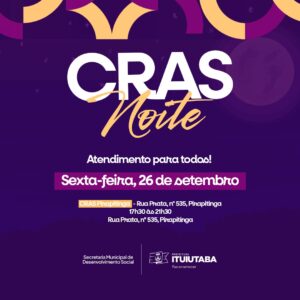 A Prefeitura de Ituiutaba, por meio da Secretaria de Desenvolvimento Social, realiza nesta sexta-feira (26) a primeira edição do projeto CRAS Noite, no Centro de Referência de Assistência Social (CRAS) do bairro Pirapitinga, localizado na Rua Prata, nº 535. O atendimento será das 17h30 às 21h30.